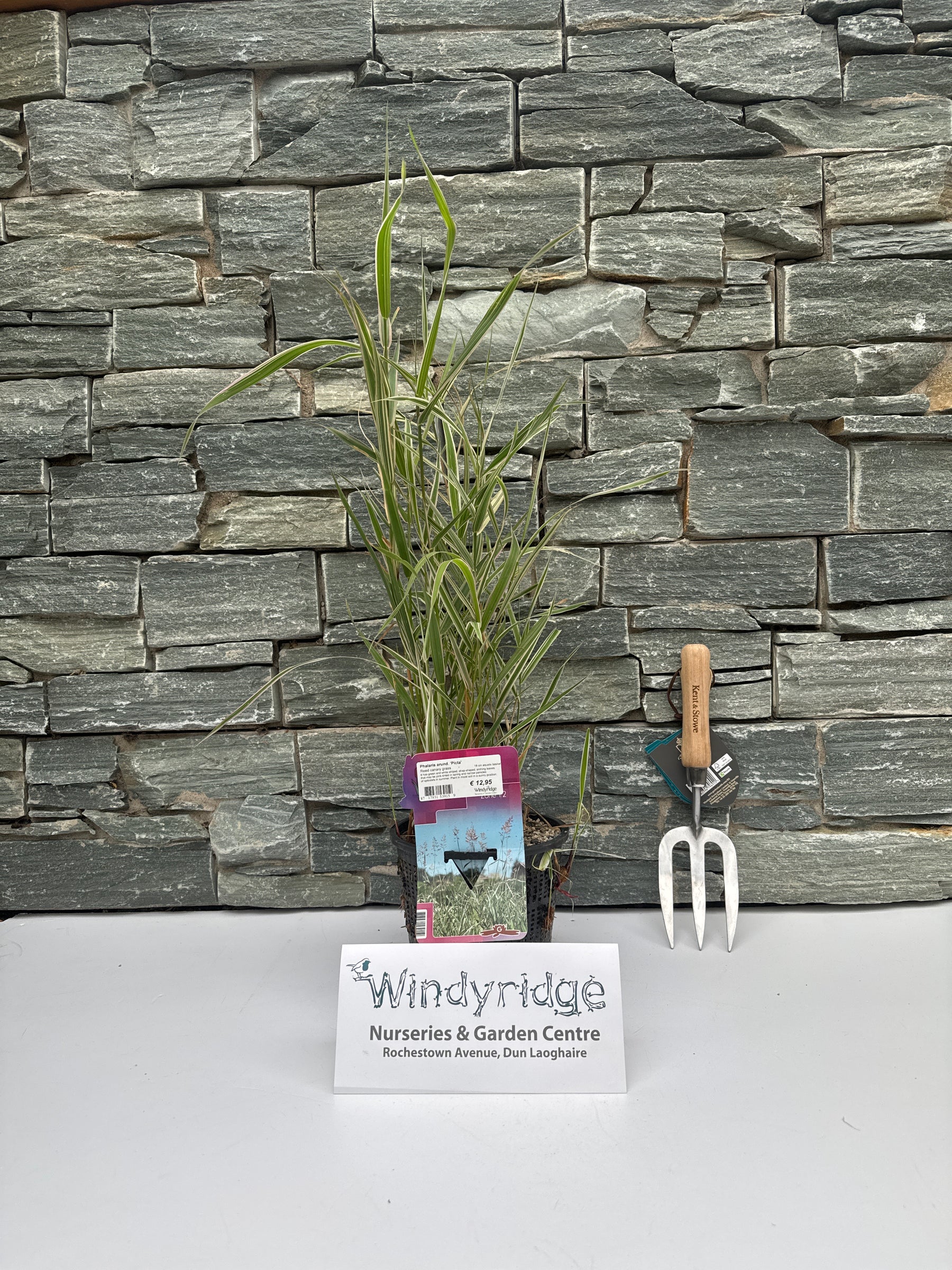 Phalaris arund. 'Picta' Reed canary grass, in aquatic basket with gravel |