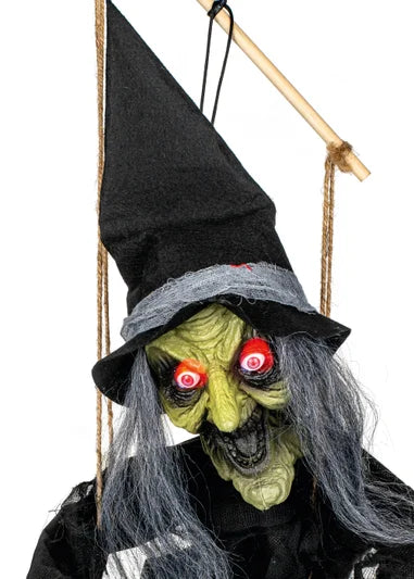 Create a spine-tingling atmosphere this Halloween with the 70cm BO Witch in Swing! Suspended in mid-air, this eerie witch figure swings back and forth, her legs kicking in rhythm as if she's soaring through the night sky. Complete with sound effects that enhance the haunting ambiance.. This witch is the perfect addition to any Halloween display, adding both movement and sound to captivate and scare trick-or-treaters or party guests. Easy to set up, durable, and sure to be a standout in your spooky decorations.