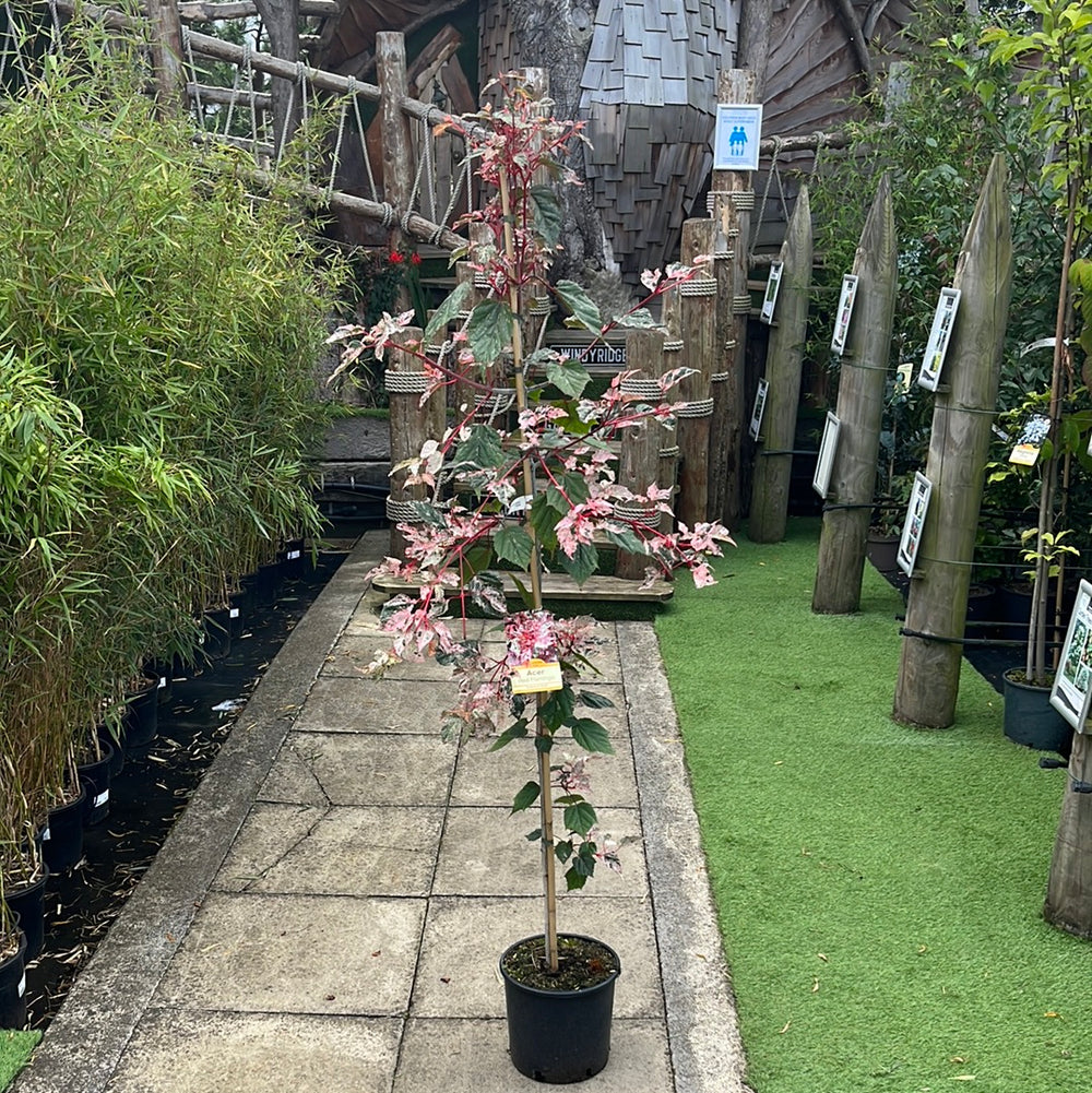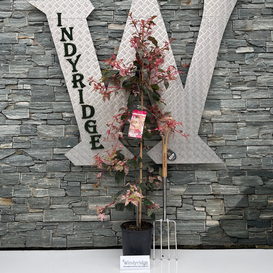 The Snakebark maple 'Red Flamingo' is an upright to spreading, deciduous shrub or small tree with white-striped, red bark, bright red juvenile shoots, and toothed, shallowly and irregularly-lobed leaves, green and pink-mottled when young turning white-mottled, dark green with maturity. Insignificant yellow-green flowers in late spring are followed by winged seed pods.
