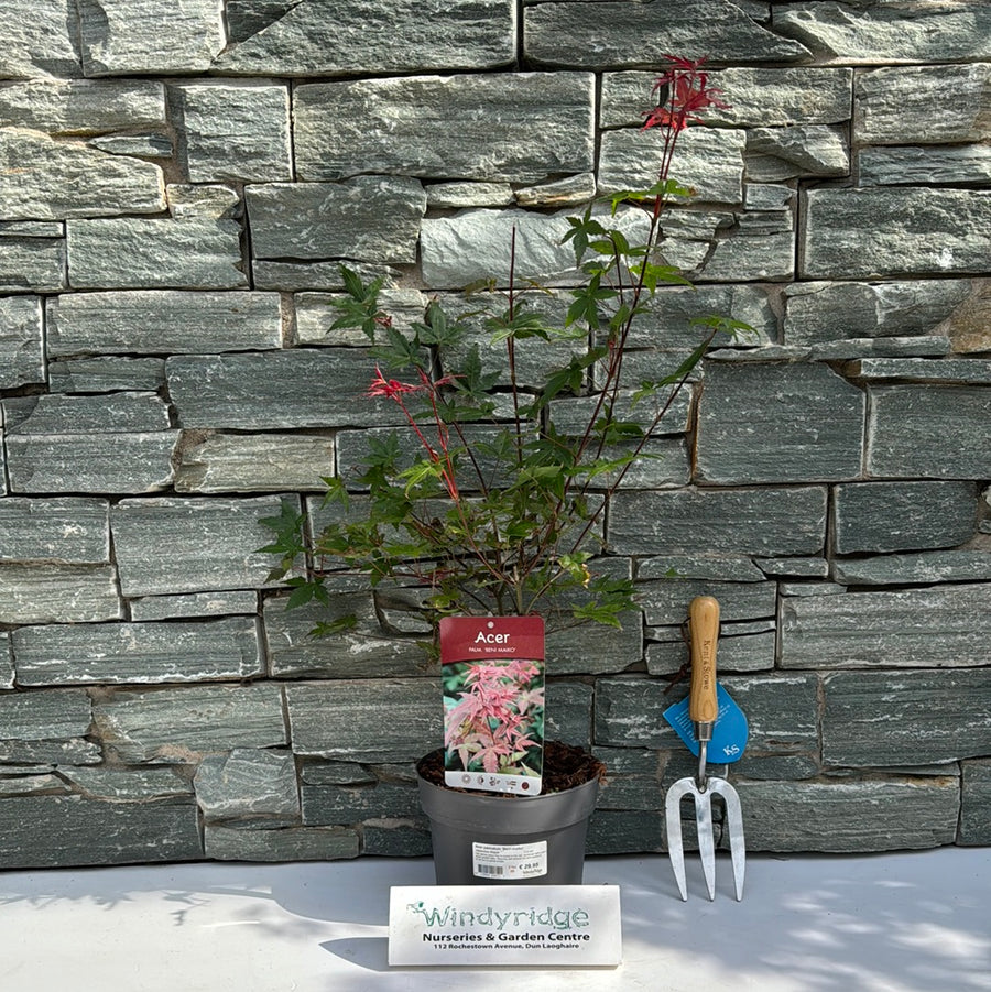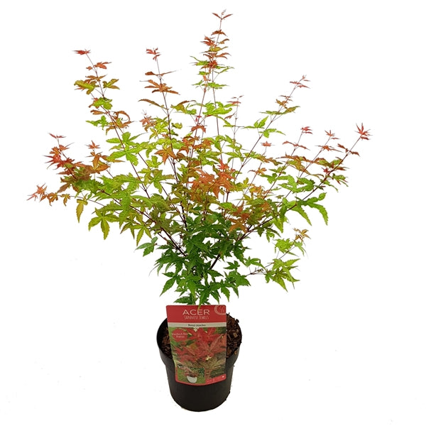 'Beni-maiko' is a upright to rounded, compact, slow-growing, deciduous shrub or small tree with rounded, deeply-lobed leaves opening bright red in spring, fading to reddish-pink, turning green by summer and orange in autumn.