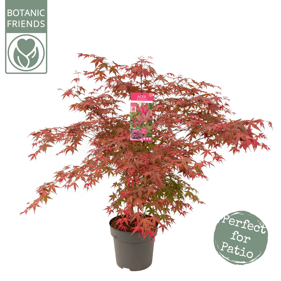 'Beni-maiko' is a upright to rounded, compact, slow-growing, deciduous shrub or small tree with rounded, deeply-lobed leaves opening bright red in spring, fading to reddish-pink, turning green by summer and orange in autumn. H & S : 3x3m
