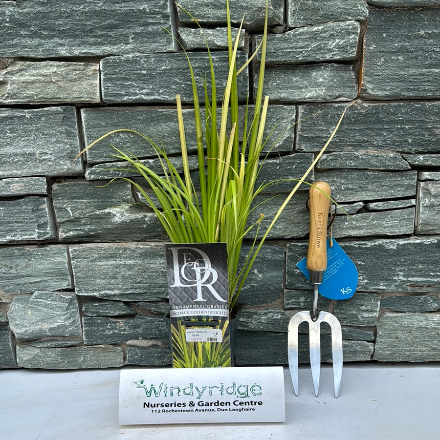 Acorus 'Golden delight' is a spreading, tufted herbaceous perennial with aromatic, sword-shaped leaves striped longitudinally with golden yellow. Ideal for boggy soils and around ponds.
