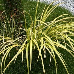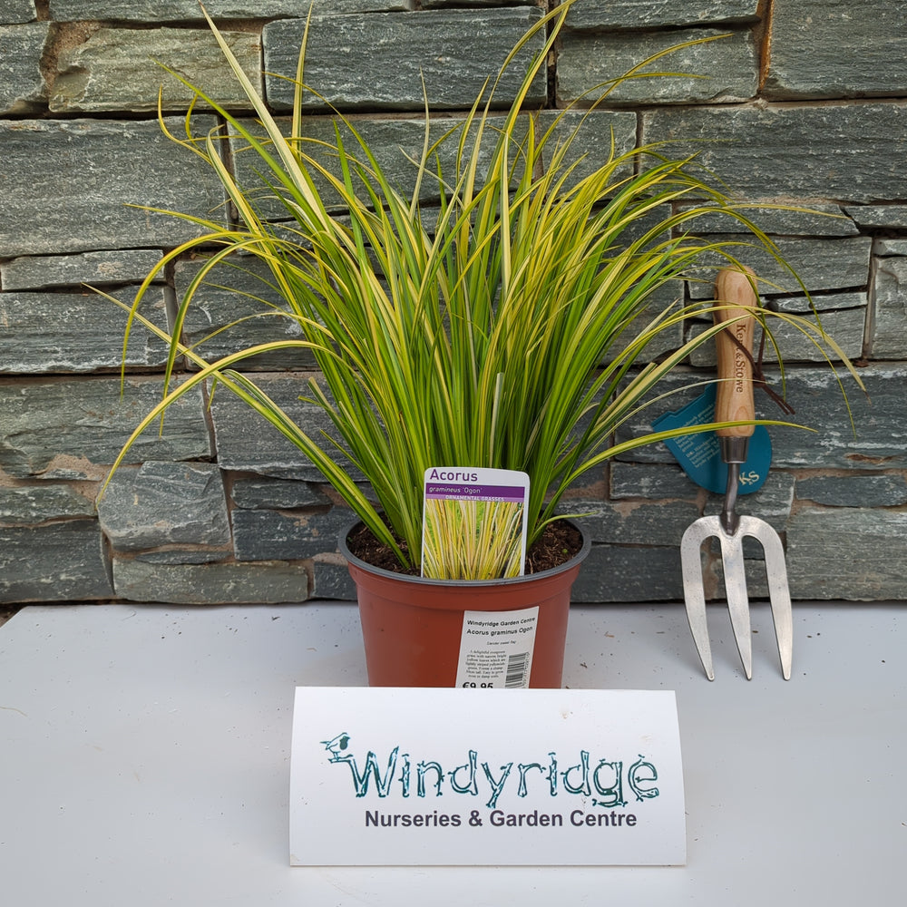 Acorus 'Ogon' is an evergreen, ornamental grass with vivid golden, variegated leaves. Ideal for heavy or boggy soils.