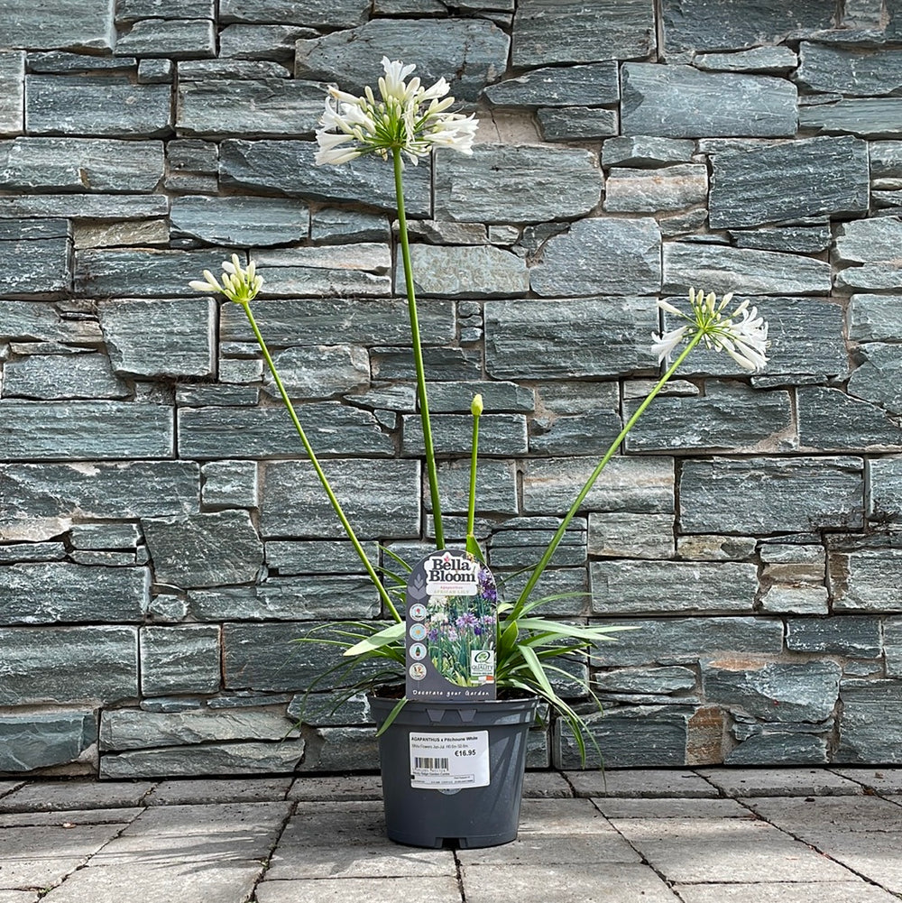 AGAPANTHUS 'Pitchoune White' is a compact and elegant perennial plant known for its stunning white flower clusters. It is a variety of Agapanthus, commonly known as Lily of the Nile or African lily. The 'Pitchoune White' cultivar is specifically bred to thrive in various climates, including the Irish climate.
