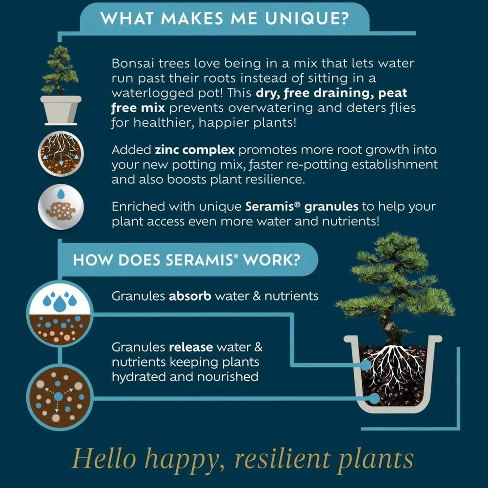 Bonsai Potting Mix is naturally peat free and formulated for the correct balance of drainage and water retention as well as aeration. This is all required to develop a healthy root system, and is essential for healthy bonsai growth. This mix also contains special water retaining granules from Seramis for optimum water and nutrient availability.