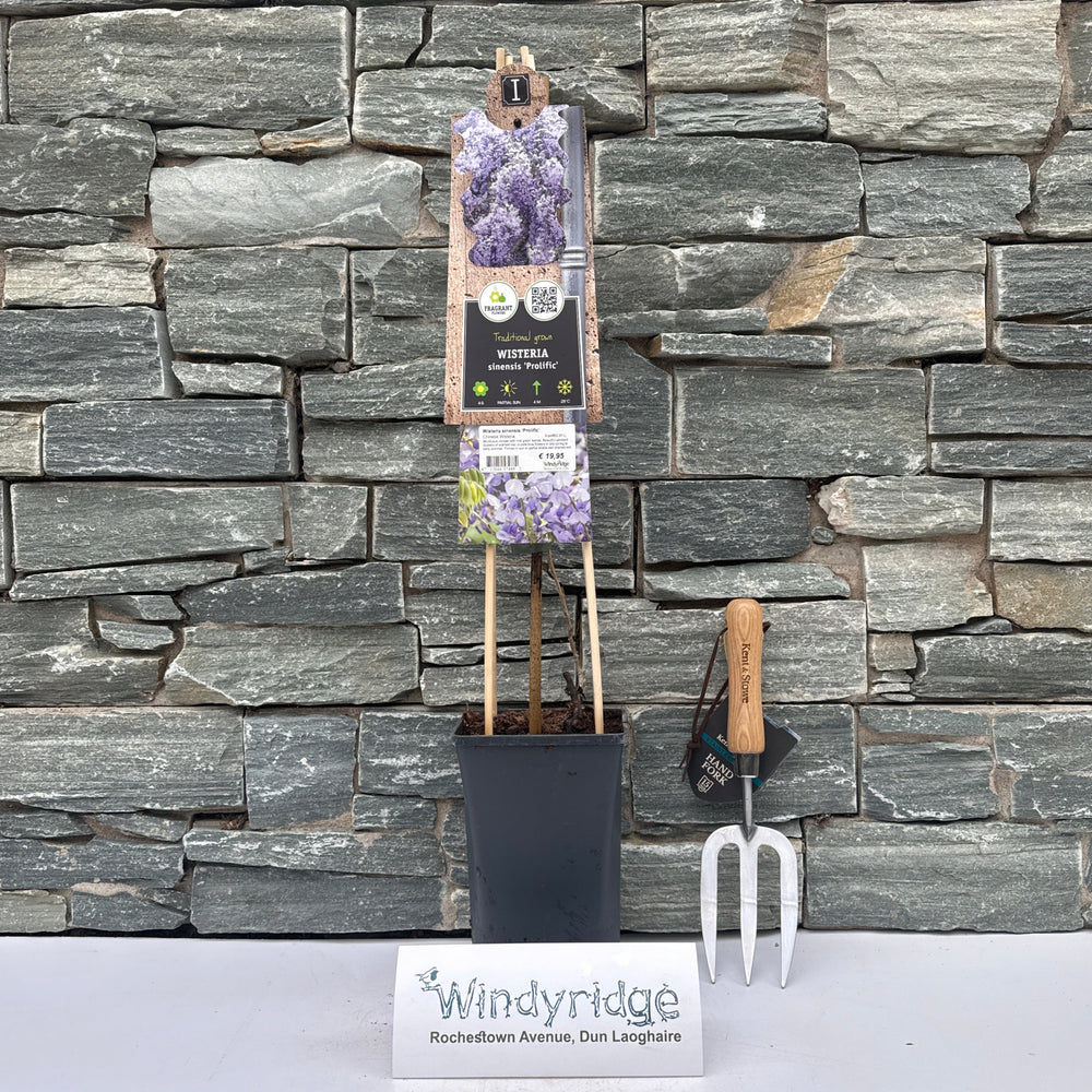 Wisteria sinensis 'Prolific' is a captivating deciduous climber renowned for its abundant and fragrant cascades of lavender-blue flowers. In the Irish climate, it adds a touch of elegance to gardens, particularly when trained against walls, trellises, or pergolas.