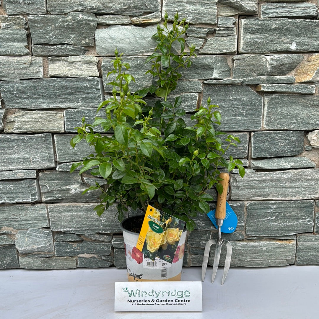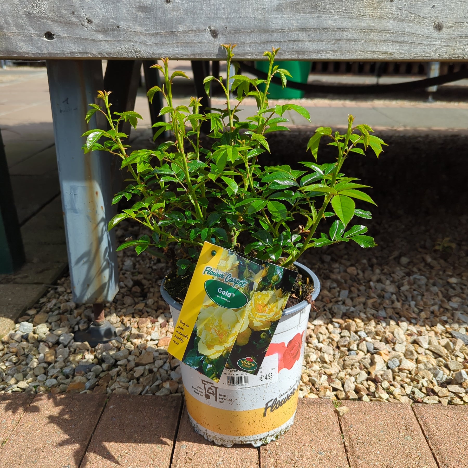 Potted Rosa Carpet Gold.Common Name: Flower Carpet Gold