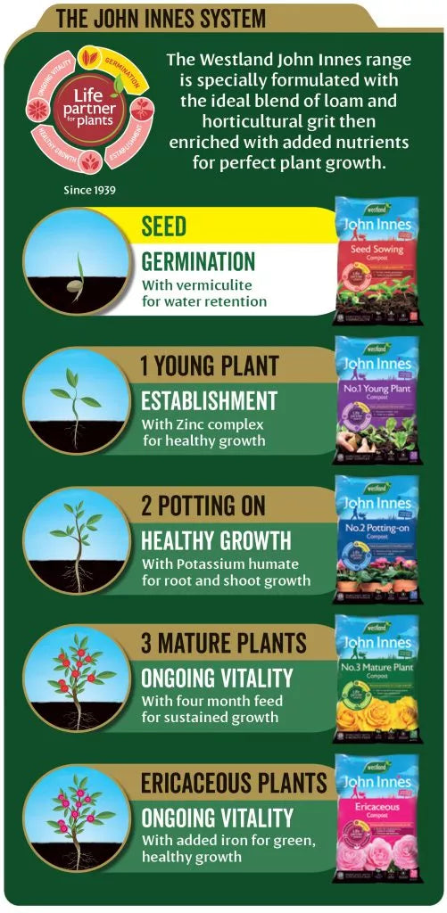 A. John Innes Composts are designed to be a life partner for plants. John Innes Seed Sowing Compost has a small amount of nutrients to encourage germination. John Innes No1 has a little more nutrients, perfect for transplanting seedlings. John Innes No2 is used for potting on young plants and Westland John Innes No3, which has the most nutrients, is best used for final potting up of plants. John Innes Ericaceous is suitable for all acid loving (lime-hating) plants