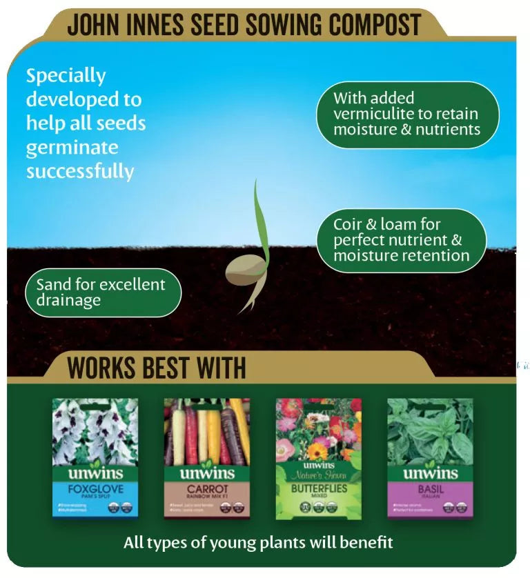 Westland John Innes Seed Sowing Compost is naturally peat free. It is perfect for bringing seeds to life for fast as well as healthy germination. Enriched with vermiculite to retain moisture and nutrients, it also feeds for the first three weeks. John Innes Seed Compost also contains sand for excellent drainage as well as coir and loam for perfect nutrient and moisture retention.