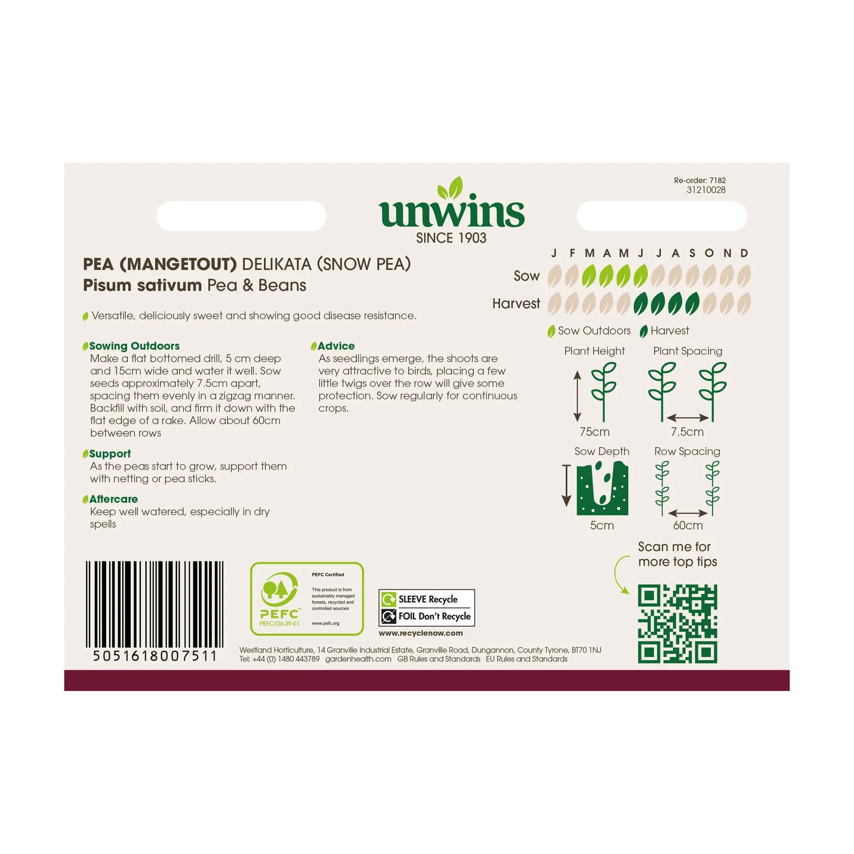 Unwins Mangetout Snow Pea Delikata Seeds are a RHS Award of Garden Merit variety producing versatile mangetout as well as shelled peas. You can pick deliciously sweet mangetout pods or wait until the pods are bulging and then shell out the equally sweet peas. Pack size : 130 seeds.