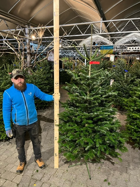 The designer's choice, Wicklow-grown excellence. The Noble Fir stands out with its rich blue-green hue and layered branch structure, a testament to its Wicklow origins. Its stiff, upward-curving branches provide ample space for creative decorating, making it perfect for displaying cherished ornaments and festive garlands. This tree boasts a robust, full-bodied shape and a subtly sweet, woodsy aroma that enhances the cosy ambiance of your celebrations. Known for its exceptional needle retention and ability to hold heavy decorations with ease, the Noble Fir is the perfect choice for those who want both style and substance in their holiday decor.