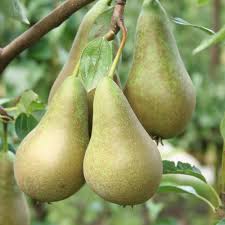'Conference' is a compact, deciduous pear tree, with white flowers in spring, followed by edible, green, dessert fruits in autumn.