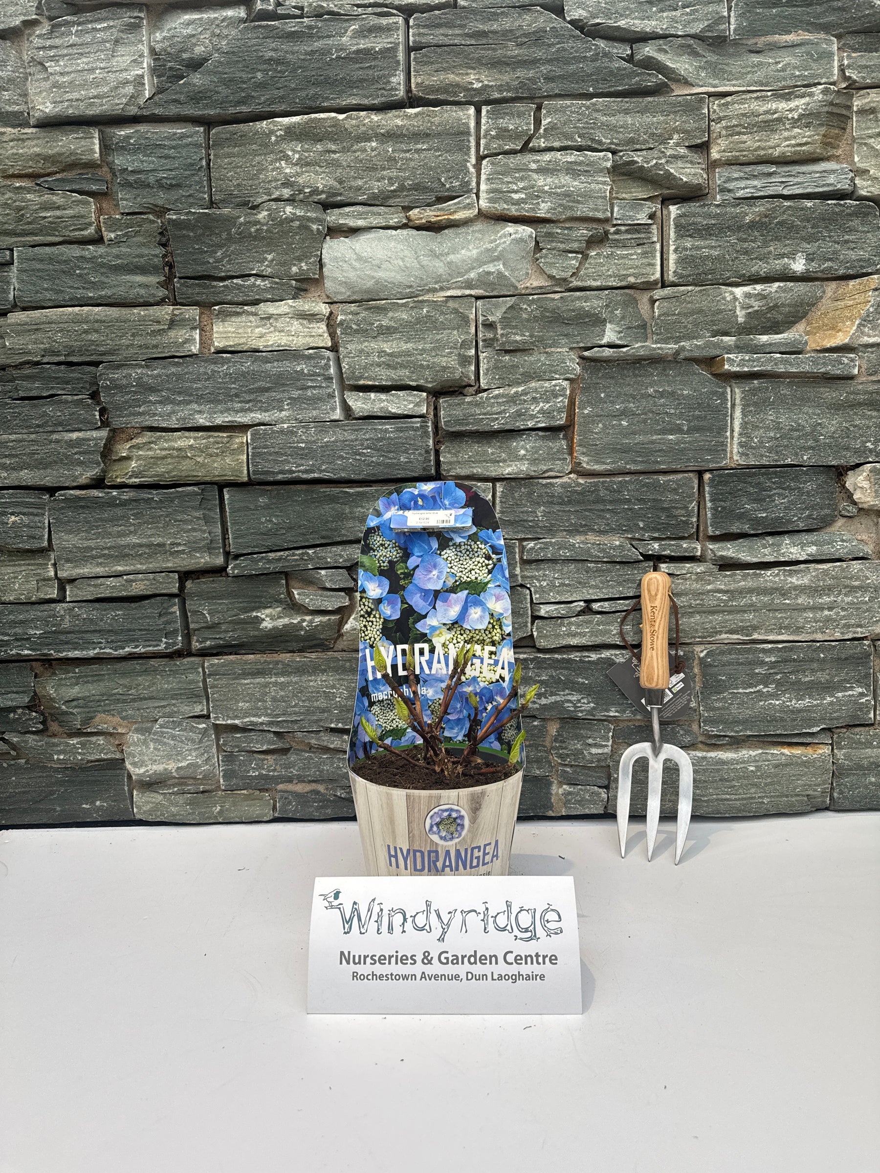 An ever-popular lacecap hydrangea with bright green, serrated leaves and flattened flowerheads. ‘Teller Blue’ bears showy outer florets around small fertile flowers from mid-summer to early autumn; on acidic soils the blooms are blue, tending towards pink on more alkaline ground. Leave the dried heads on the plant over winter for decorative effect and frost protection, then prune back to a pair of strong buds in March. Best in partial shade and moist, fertile, well‑drained, humus‑rich soil. Ideal for borders, cottage gardens and courtyard displays, and suitable for cutting. Eventual size about 1.5 × 1.5 m.
