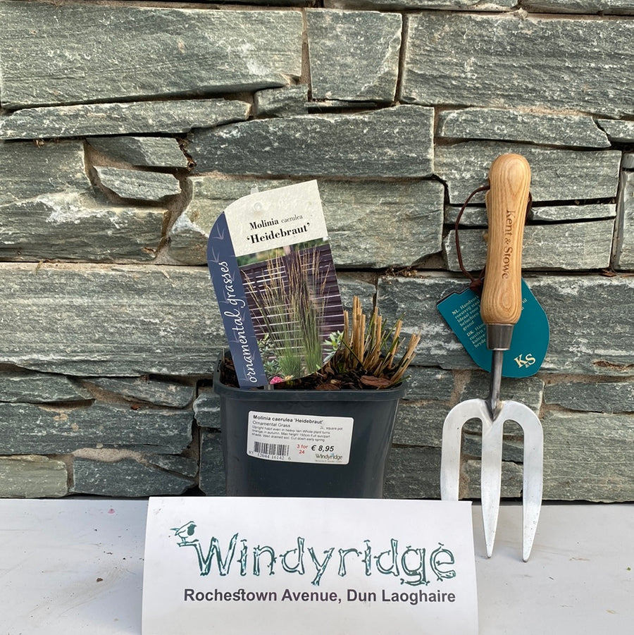 Molinia caerulea ‘Heidebraut’ is a clump-forming, deciduous ornamental grass valued for its neat, upright habit and fine, arching green leaves that turn rich golden-yellow in autumn. Airy flower stems rise in mid to late summer with elegant, purple-tinged panicles that add height and movement without overwhelming nearby planting. Best in full sun or light shade on moist but well-drained, moderately fertile, preferably acid to neutral soil, it is fully hardy in Ireland and very low maintenance. Ideal as an architectural accent in mixed borders and naturalistic schemes; cut back old foliage to the base in late winter before new growth starts.